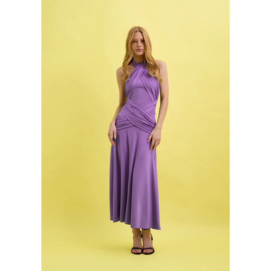 Vestido de punto con escote halter cruzado que envuelve el cuerpo, creando un efecto drapeado que realza la silueta. El diseño se ajusta desde el busto hasta la cadera con un elegante cruce frontal, dando paso a una falda fluida que aporta movimiento y ligereza.